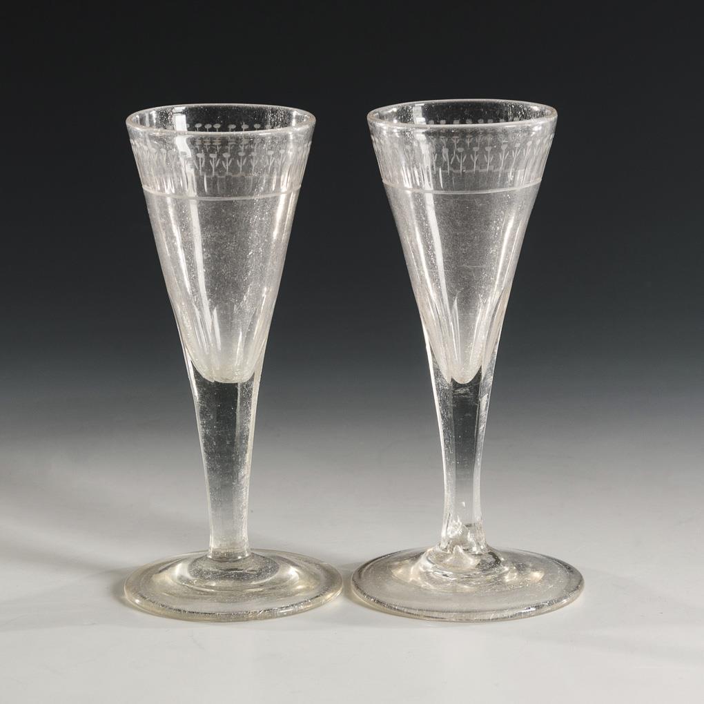 Faceted dome at base, merging into solid faceted stem, round foot, dislocated finial. On the dome an engraved border of pin flowers. Both glass-ranked.