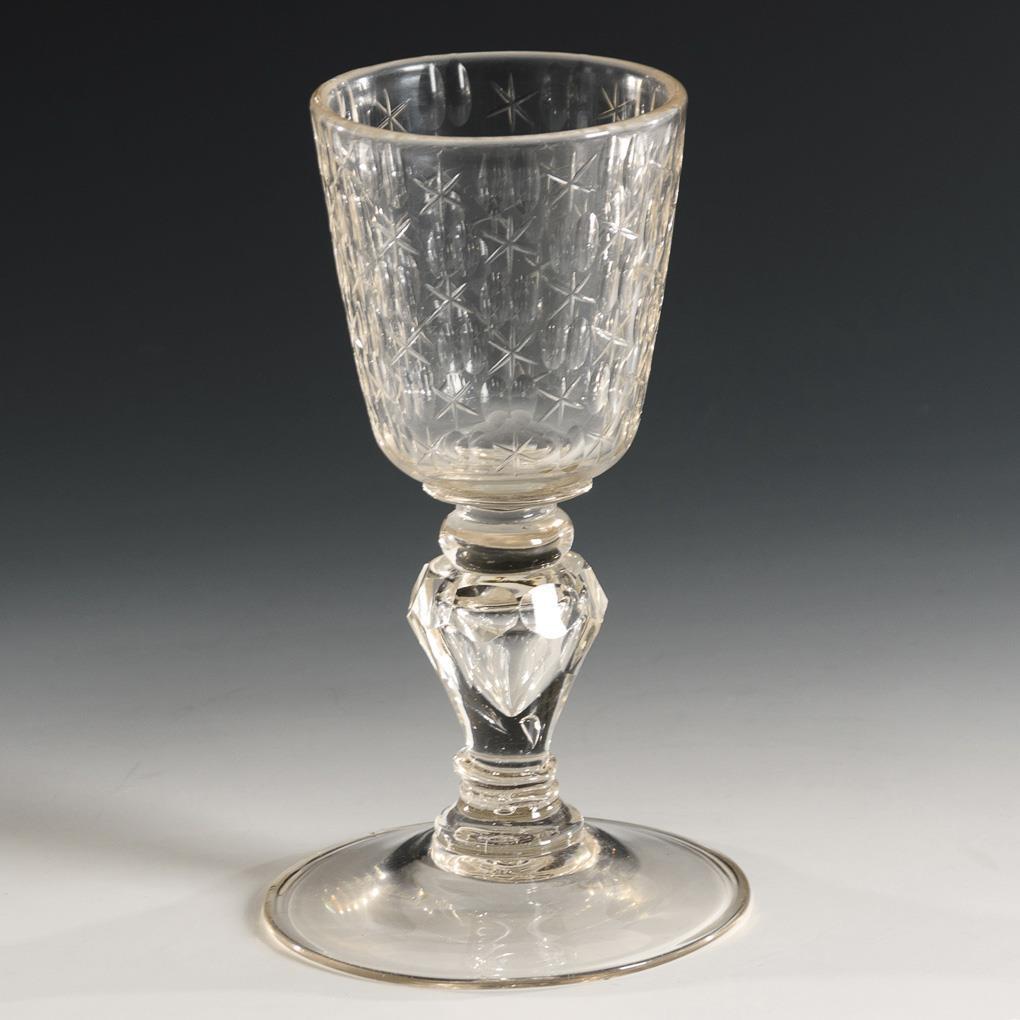 Conical cup with notched stars and double olives, honeycomb-faced baluster hollow stem, round foot, demolition.