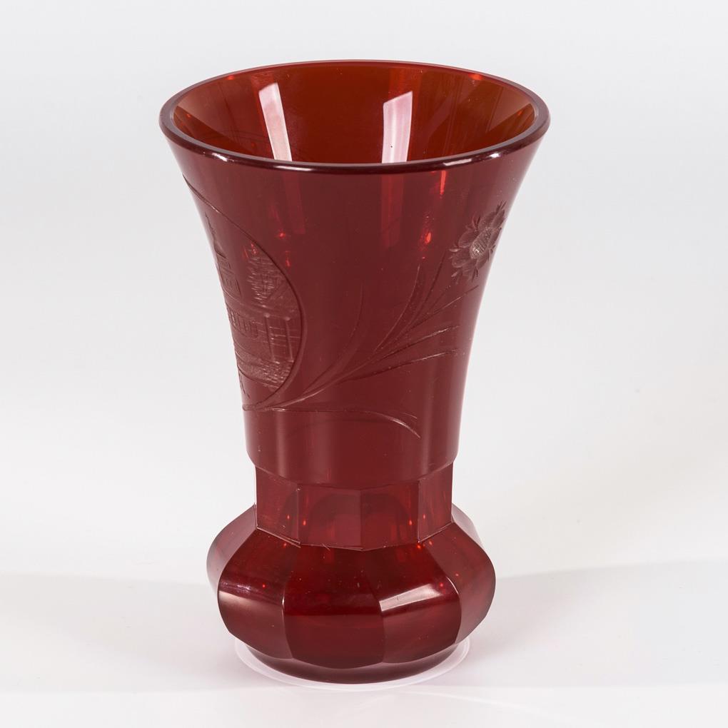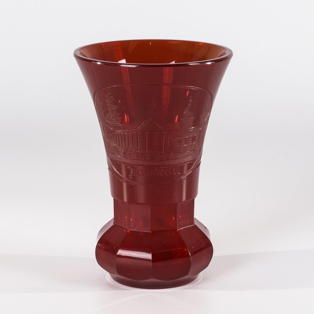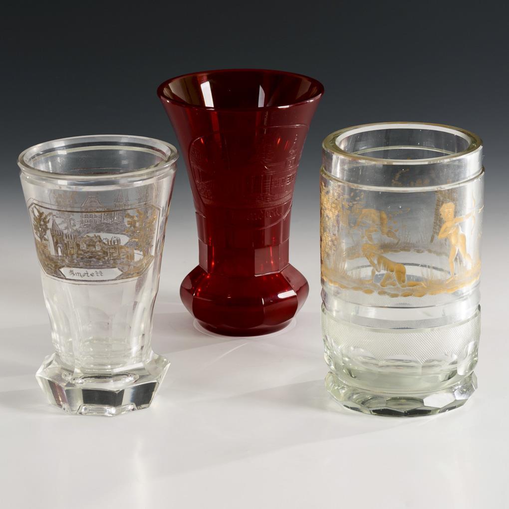 1x cylindrical beaker with the gold-stamped depiction of putti at a beehive. / 1x conical beaker, faceted at the base, with solid stand and the inscribed, gold-stamped views of "Steyr" and "Amstett". / 1x red cratered beaker with solid faceted base and an inscribed view of Bad Landeck in Silesia on the front. Gold rubbed, abrasion on the stand of the red glass and on the mouth rim of the cylindrical beaker.