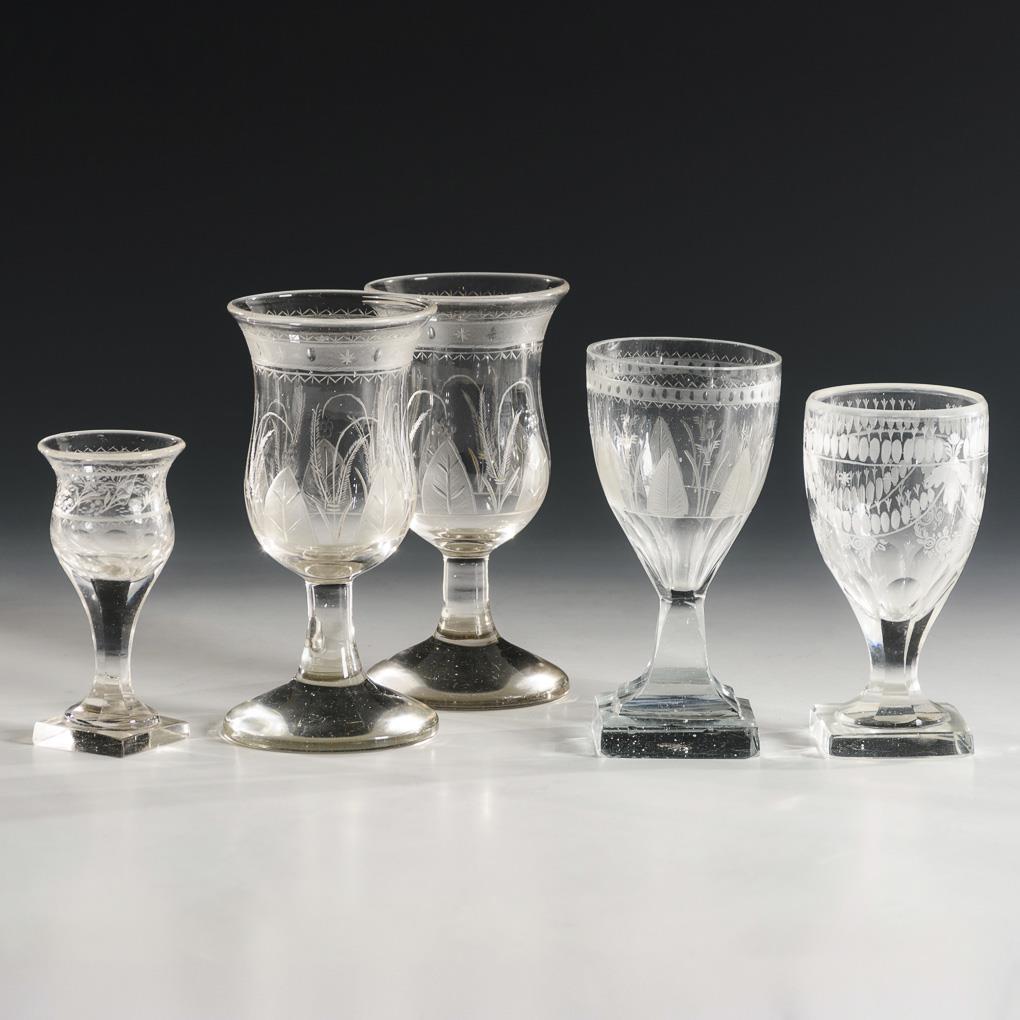 2 glasses with bell-shaped cup, solid stem and round foot, 3 different glasses with ovoid cup or bell-shaped cup, faceted stem and square foot. All with floral-ornamental decoration. Foot rims minimally bumped in places.