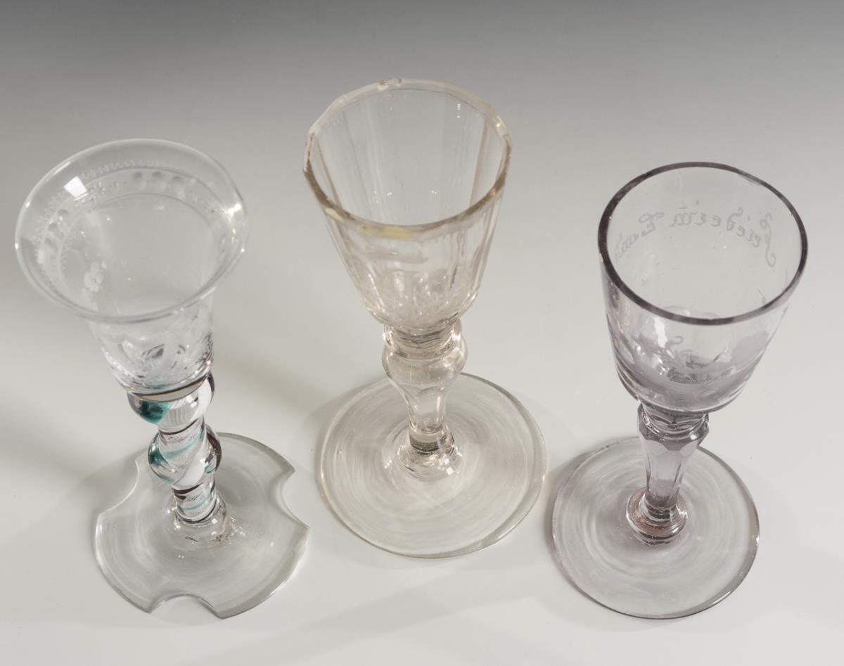 1x threaded glass, England(?): finely engraved bell-shaped cup with the monogram "BL", stem with opal white spiral threads as well as spiral fused brown, purple and turquoise thread. / 1x glass with multiple faceted conical cup with the monogram "MK", faceted stem, round foot. / 1x goblet glass of manganese-stained glass: conical cup engraved with a peace symbol, faceted at the base, faceted baluster stem, round foot. Filament glass with cut foot and mouth rim, 1x with defective mouth rim, 1x with cut mouth rim.