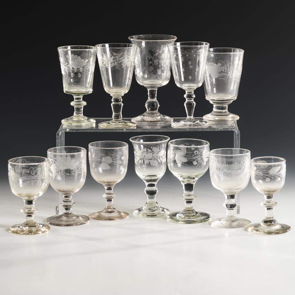 Various goblets with predominantly floral engraving. 1x with foot bump, 1x with minimal rim bumps.