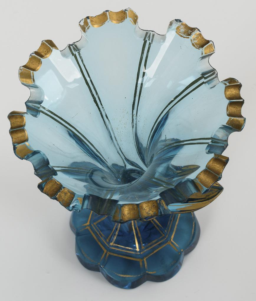 1x faceted goblet of colourless, red stained glass with enamel and gold painted rocailles (h 12 cm). / 1x faceted goblet of light blue glass with a cupola in the shape of a cornucopia, gold decoration (h 14,5 cm). / 1x faceted flask of white alabaster glass with gold decoration (h 18 cm). / 1x shot glass of white alabaster glass with a cupola in the form of a cornucopia (h 8 cm). Full horn glasses with bumped foot and mouth rim.
