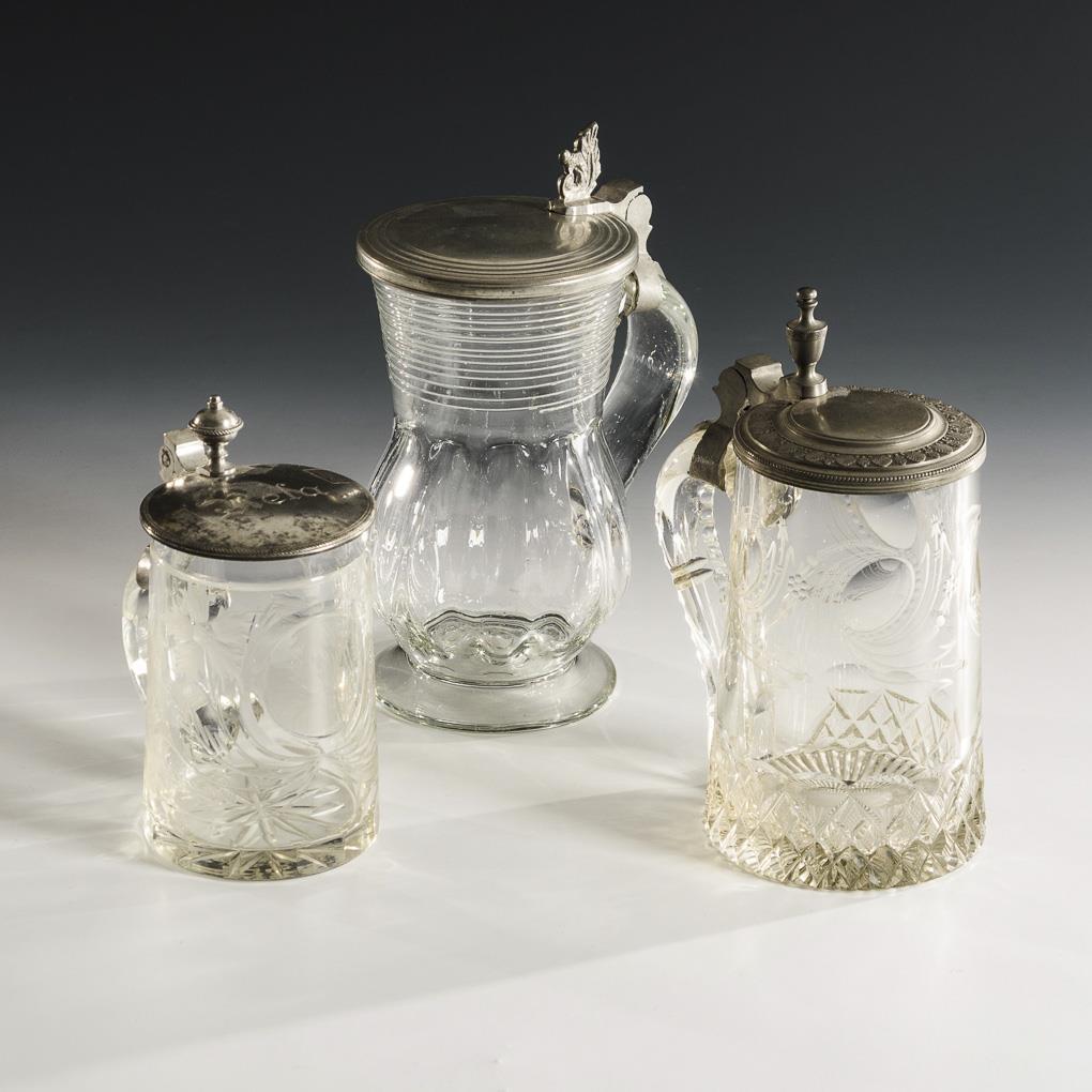 Colourless glass, pewter mounted hinged lid. H 14-20 cm.