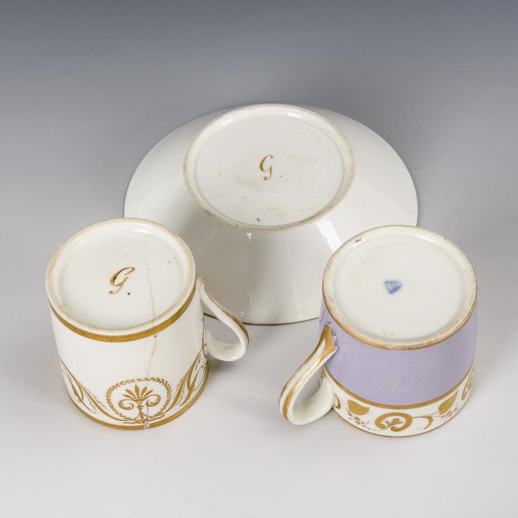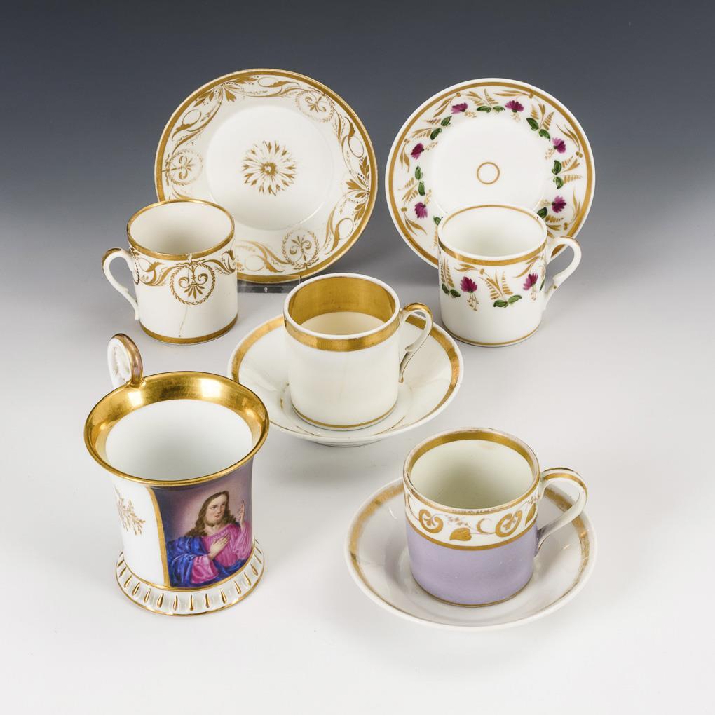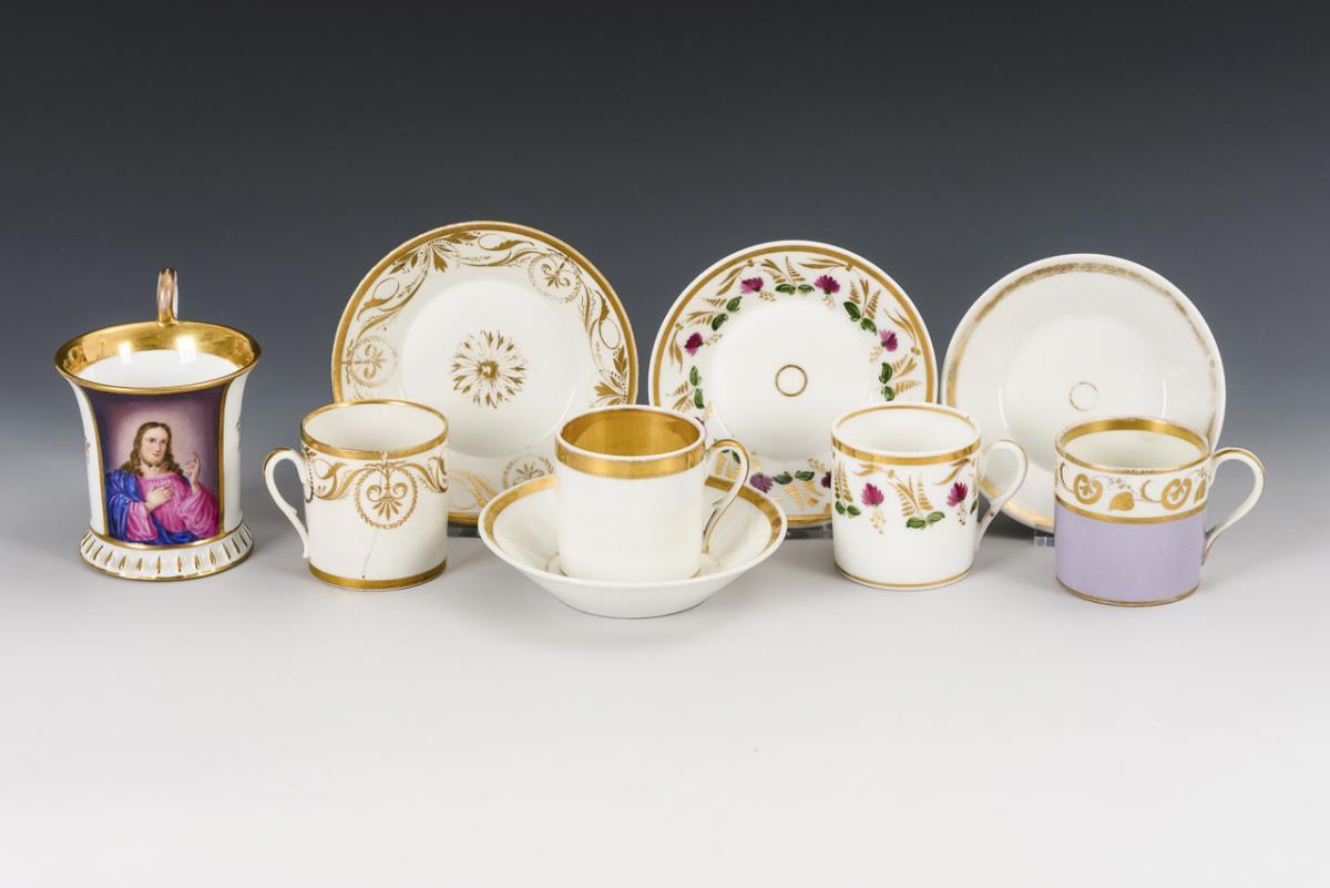 4x cylindrical cups with ear handles: 1x with purple partial background, 1x with gold painting, 1x with floral painting and 1x gold decorated. / 1x crater cup with the depiction of the blessing Christ. Partial gold abrasion, hairline crack in 1 cup, crater cup without saucer.