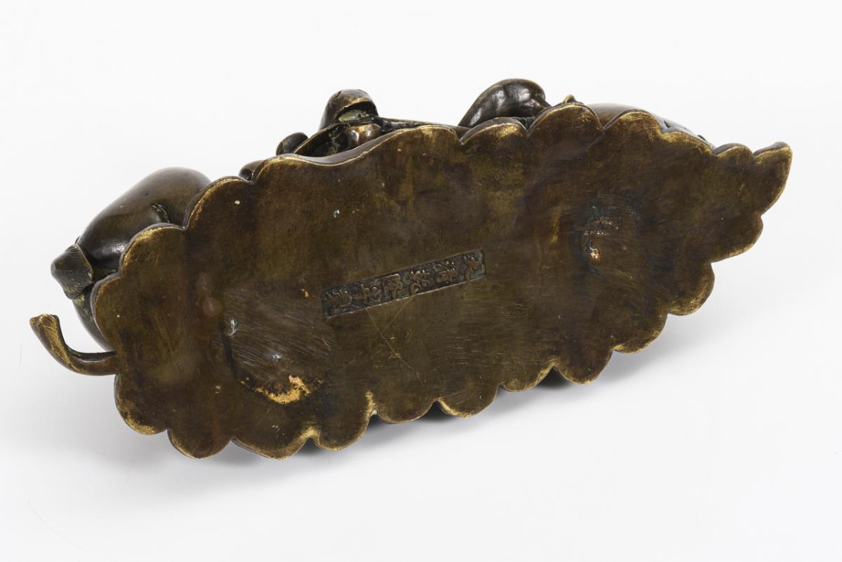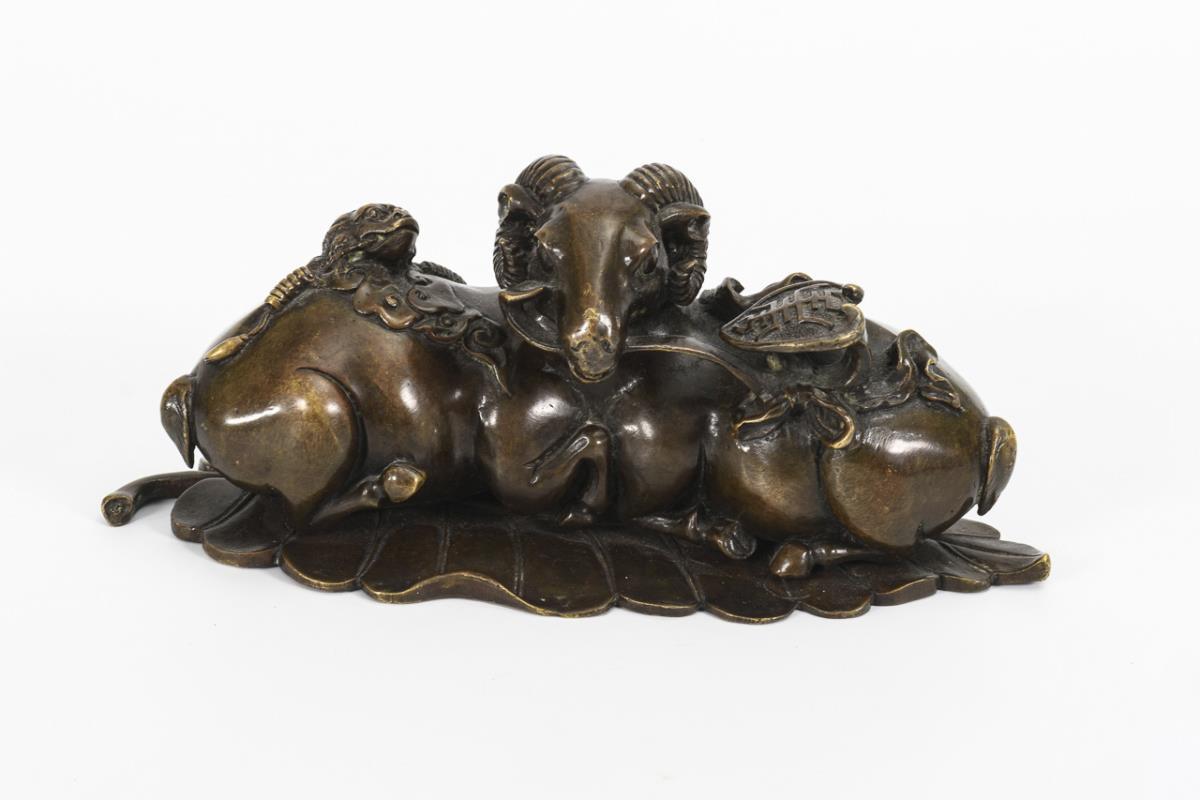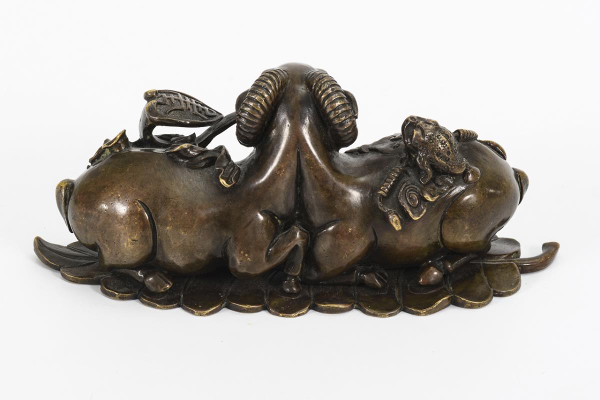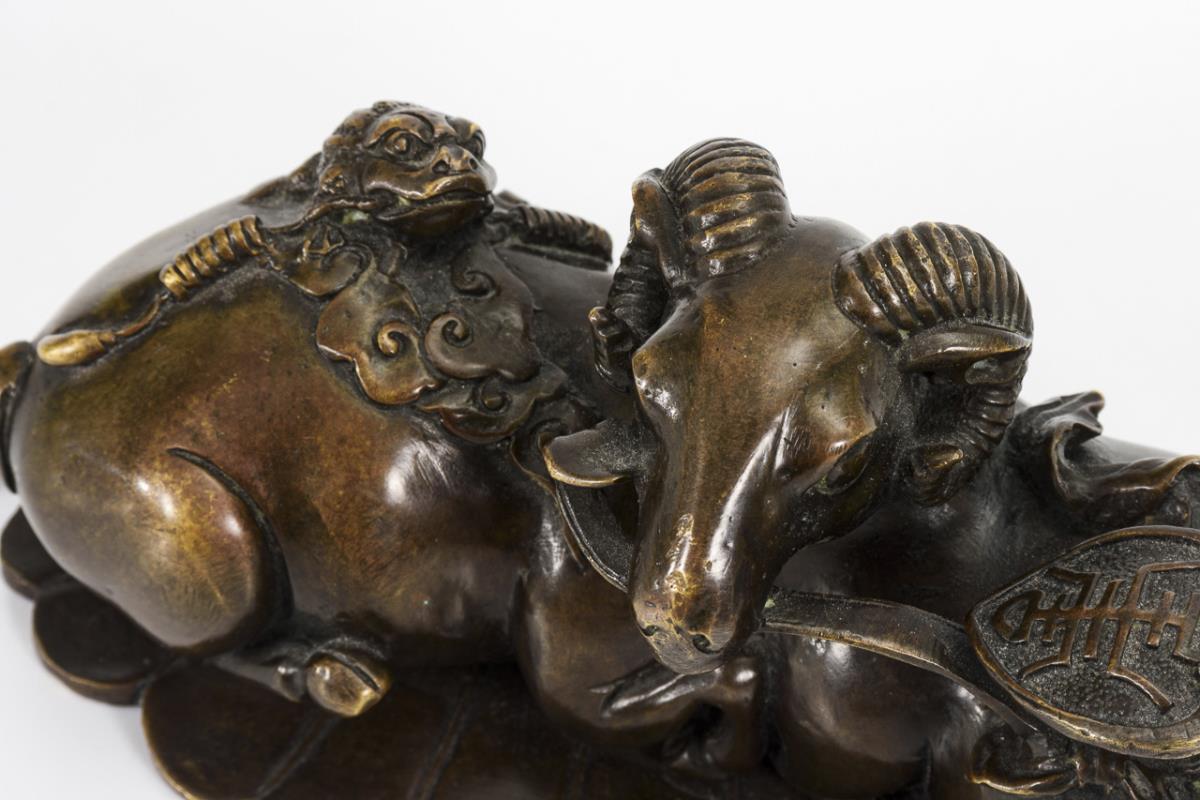 On a leaf base resting two animals sharing a head, in the mouth a Ruji scepter with the character double happiness.