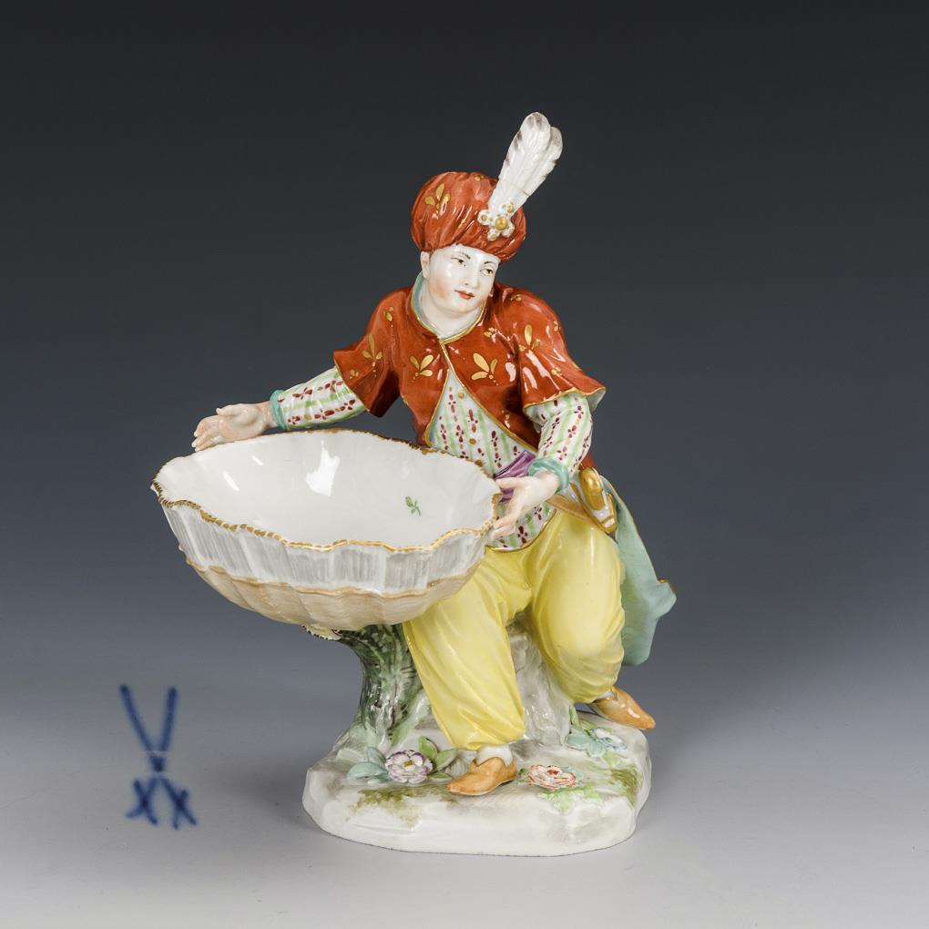 Orientally dressed gentleman with turban, carrying a bowl as saliere. Glued chip at the hem of the robe, agraffe glued.