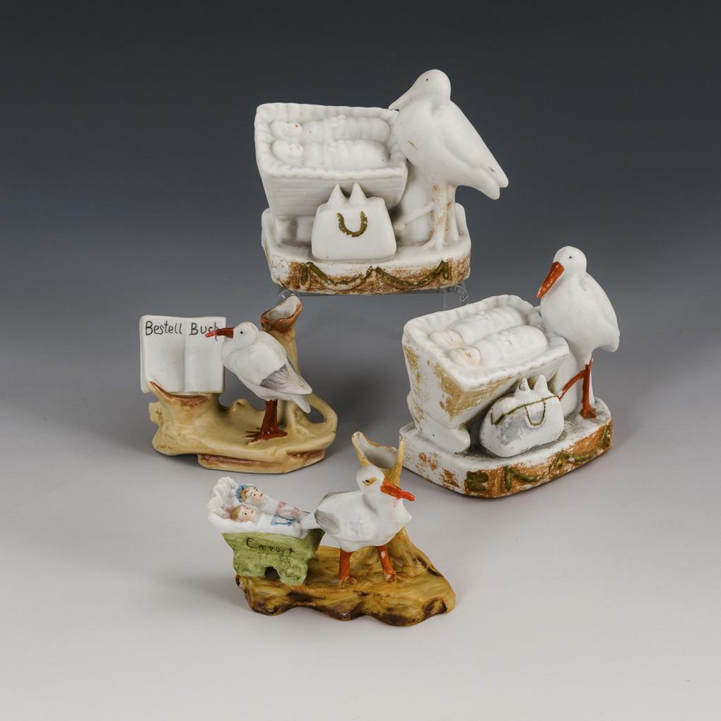 2x stork standing at a cradle with twins. / 1x stork at a baby carriage with two children. / 1x stork standing in front of an "order book". 2x beak glued, partly rubbed.