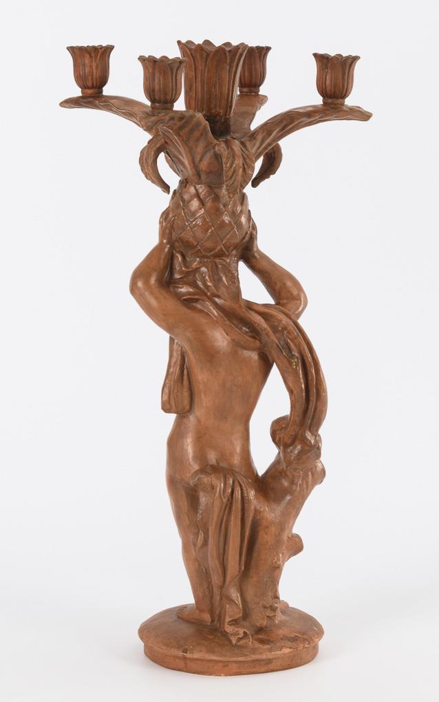 Figural candelabra with putti shaft and pineapple crown with 5 floral spouts, on round base. Middle spout glued.