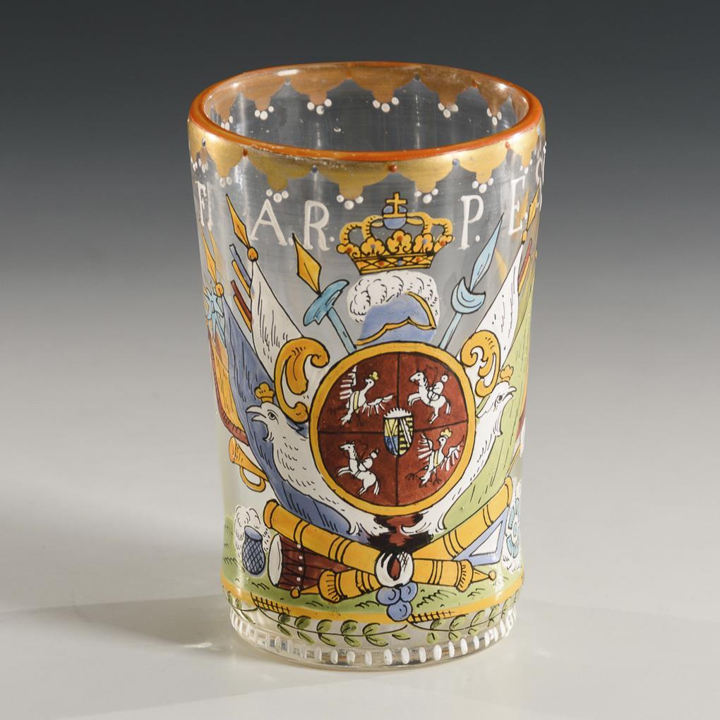 Conical cup, worked after the drinking glass of August the Strong, demolition. On the front a representation of a coat of arms and the inscription "A. R. P. E.". Minimal paint abrasion on the rim of the mouth.