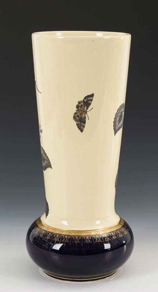 Stoneware, cream and cobalt blue glaze, matte-rough glaze application, color and gold decoration. H 39.3 cm.