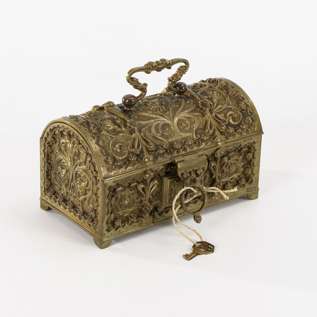 Rich relief ornamentation on all sides as well as hasp on lock and hinged carrying handle.