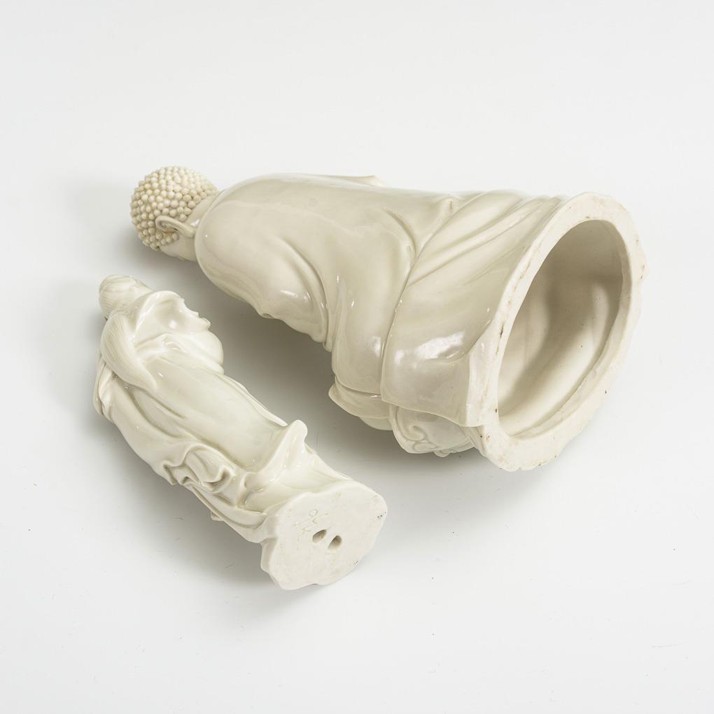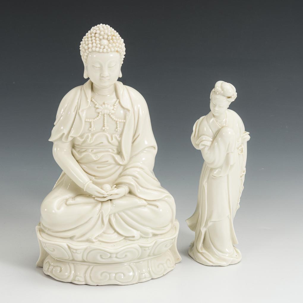 Buddha in interlocking seat with globe in hands. / Lady in flowing garment. Both figures finely formed.