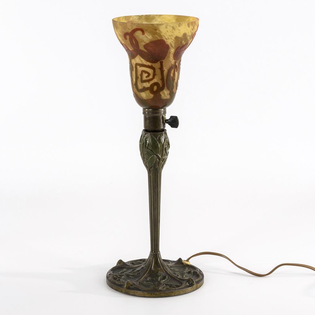 Bell shade with etched floral tendrils, on bronze base with floral relief. Electrified (function not tested). Small marginal bumps to shade.