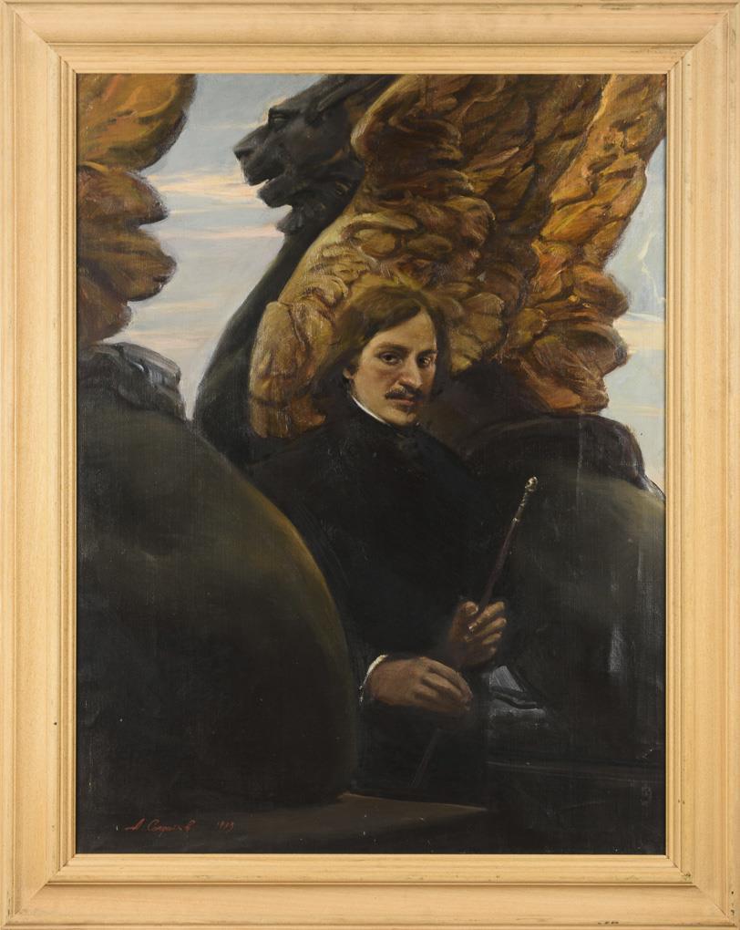 Portrait of a man in black clothes with walking stick between two large statues of winged lions.
