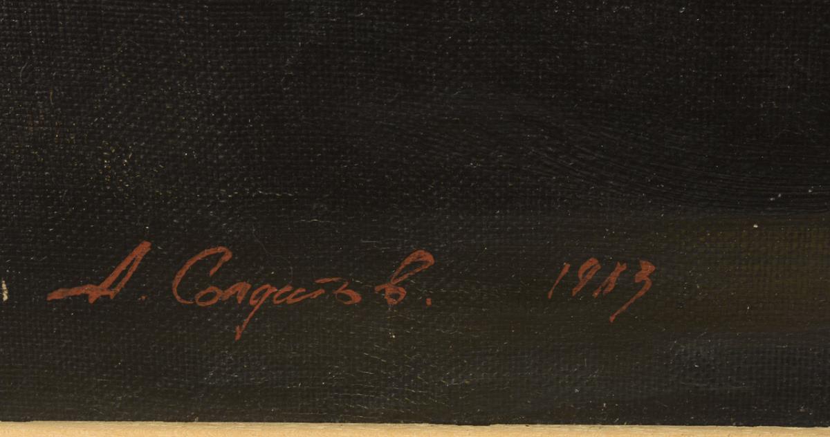 Oil/canvas. Signed in Cyrillic lower left, inscribed/titled in Cyrillic on verso.