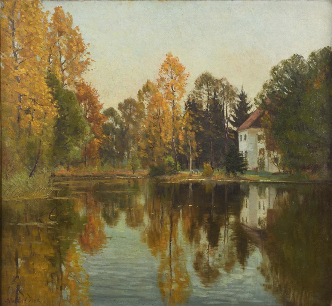 View over the quiet water, which is surrounded by autumnally colored trees and a house.
