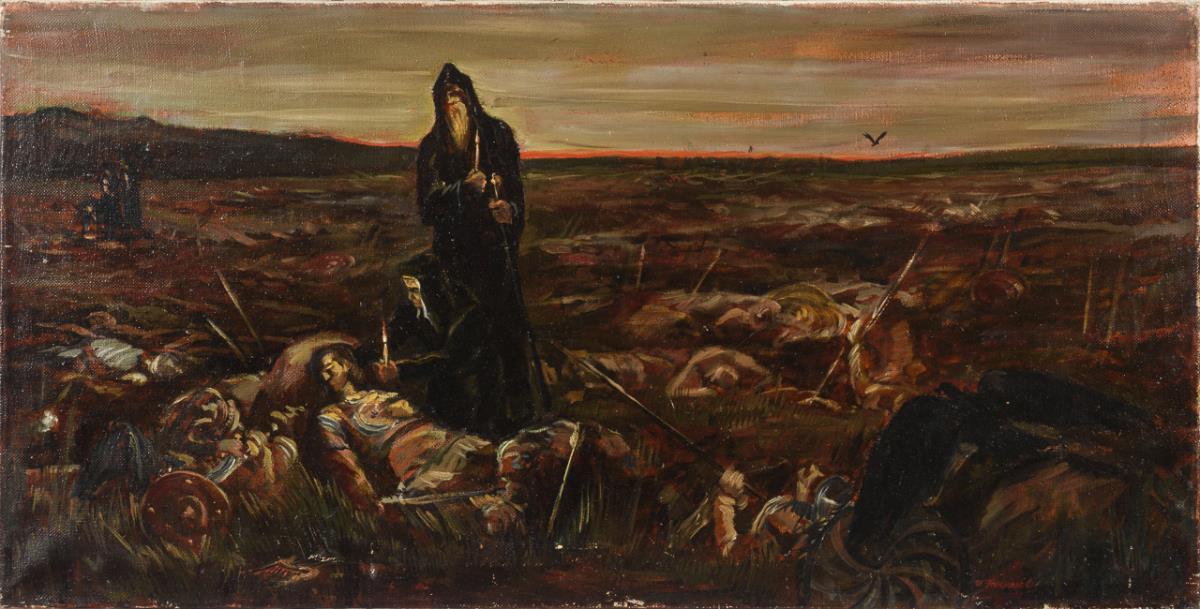 Clergyman with candle between the fallen soldiers on the battlefield. Slight signs of age.