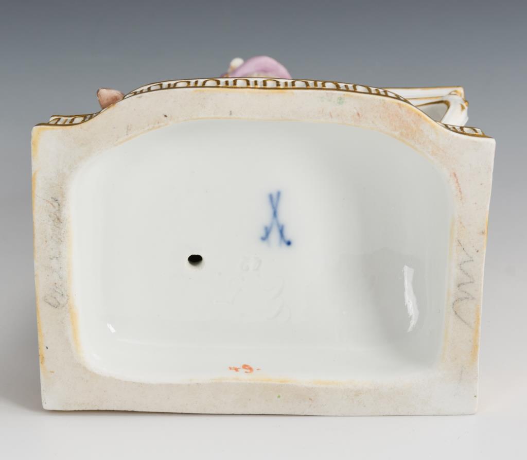 An einem Tisch mit Blumenkorb und Flakon sitzende, an einem Blumenstrauß riechende Rokokodame. 2 Blätter des Blumenstraußes minimal bestoßen.