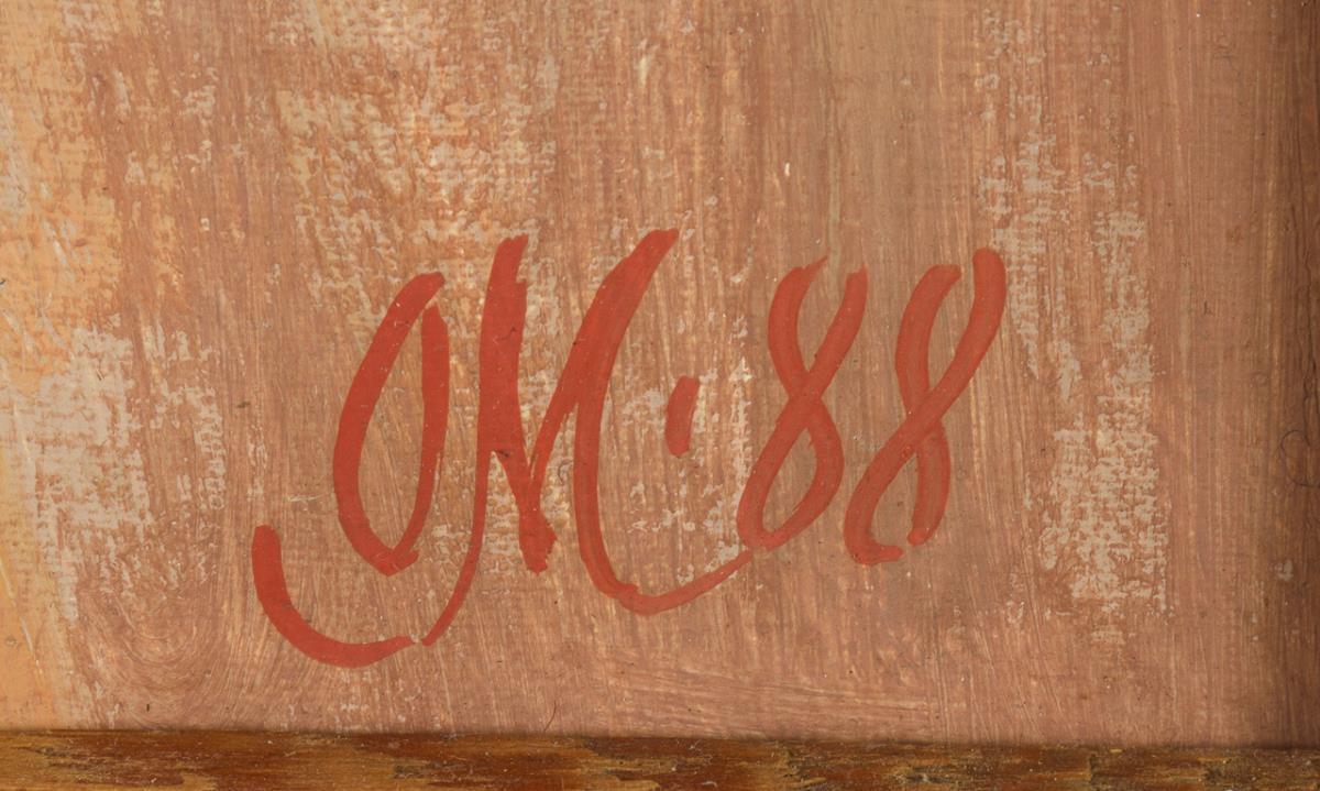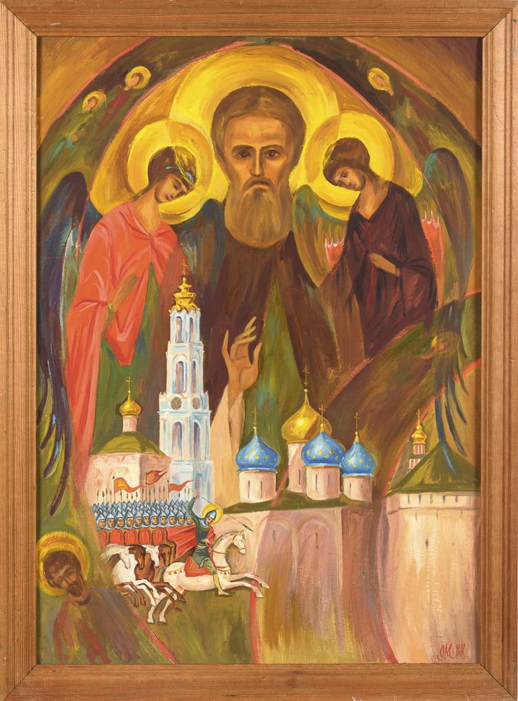 Oil/painted cardboard. Monogrammed lower right, signed/titled in Cyrillic on verso. Dated: (19)88.