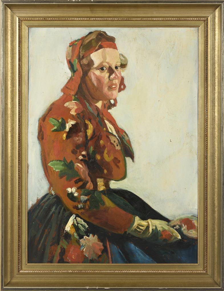 Picture of a seated young woman in colorful traditional costume against a bright background. Minimal signs of age.