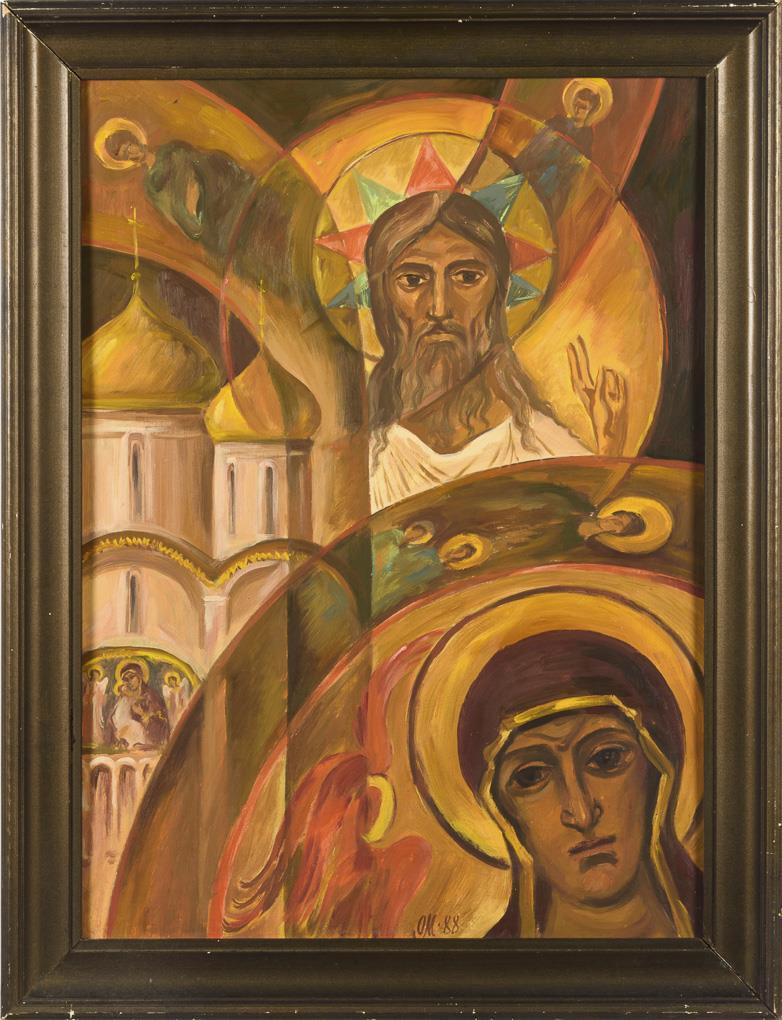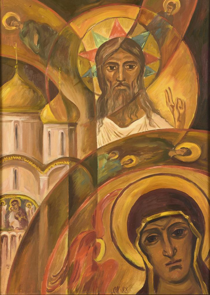 Blessing Jesus as well as the iconic face of Mary surrounded by painted vaulted architecture and the cathedral from the Moscow Kremlin.