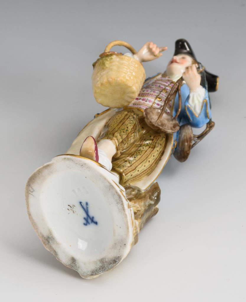 Mann mit traubengefülltem Korb und Waage. Korbhenkel geklebt, Stränge der Waage restauriert.