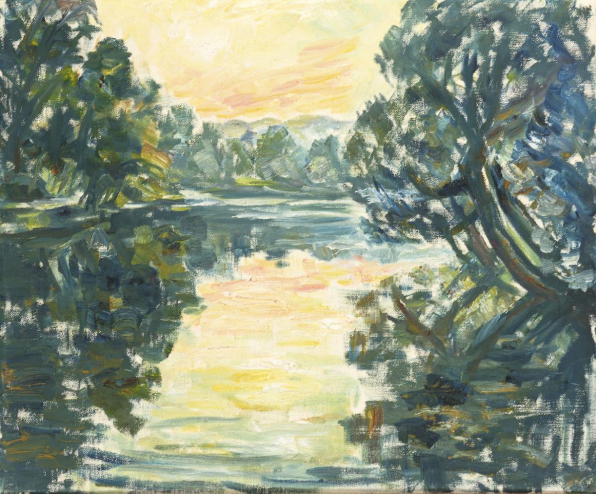 Wide water with tree tops towering densely over the water. Small holes in the corners.