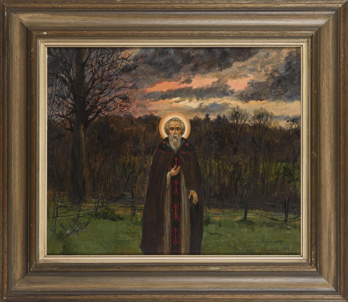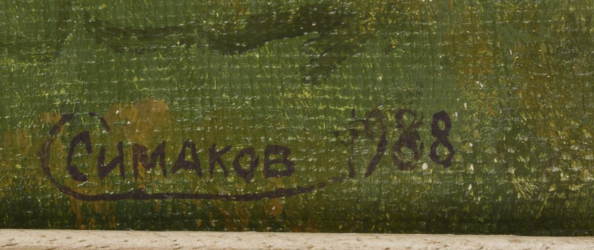 Oil/canvas. Signed in Cyrillic lower right, inscribed/titled in Cyrillic on verso. Dated: 1988.