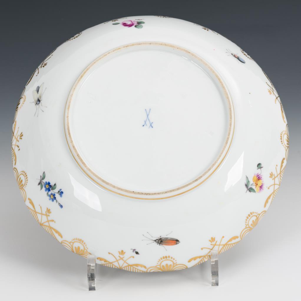 Schale mit gewelltem Rand. Im Spiegel die Darstellung eines galanten Paares in einer Parklandschaft.