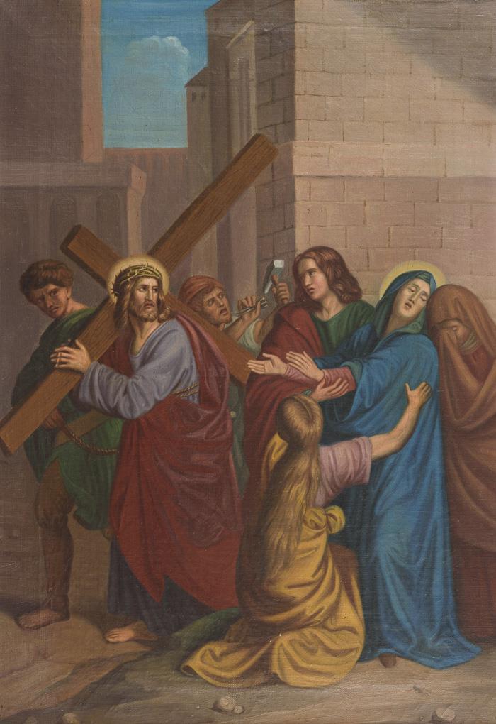 Christ with the cross on the road with lamenting Mary and weeping women. Slight signs of age.