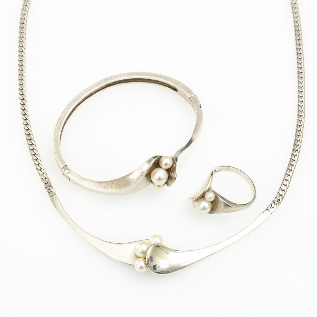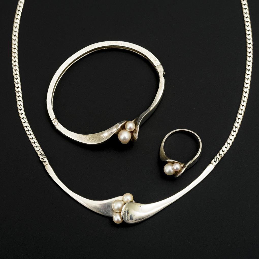 Arc-shaped showpiece, oval hinged bracelet and ring of the same shape set with cultured pearls.