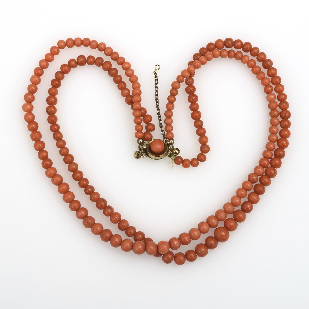 Lacing chains with coral in slight gradient, on tombac clasp. 2 thread ends knotted at lock.