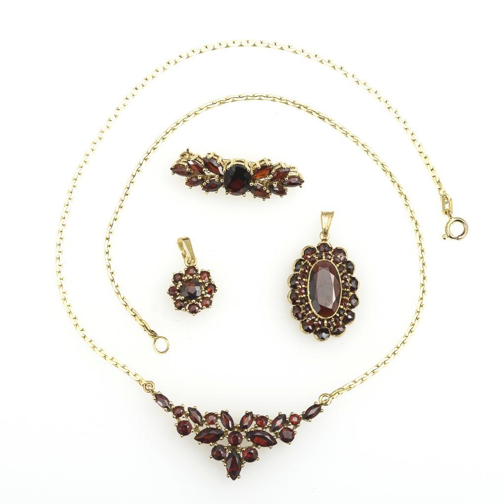 Yellow gold 333 stamped. Necklace L 41 cm. Pendant 2.5 x 1.5/Ø 1.3 cm. Brooch 3 x 0.8 cm. 6,7/4,1/1,2/3,2 g.