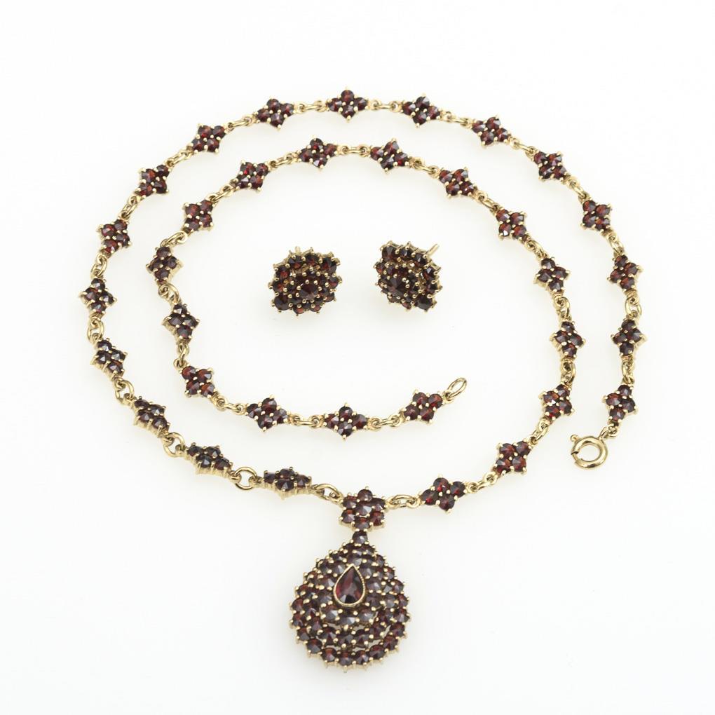 Garnet set necklace with ring spring clasp and pair of ear studs with garnets. Screw mechanism of ear studs missing.