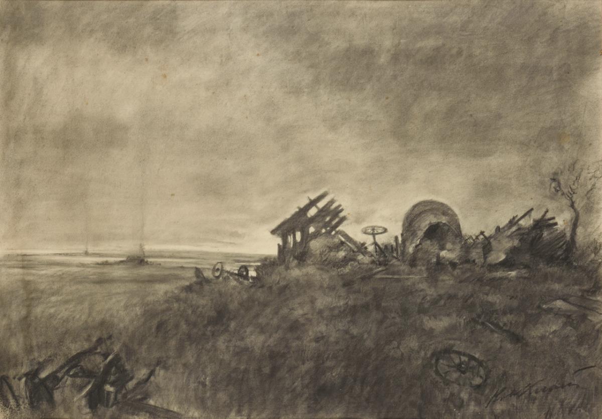 Destroyed covered wagon in a dune landscape. Slightly foxed, sheet wavy, lower left corner somewhat rubbed.