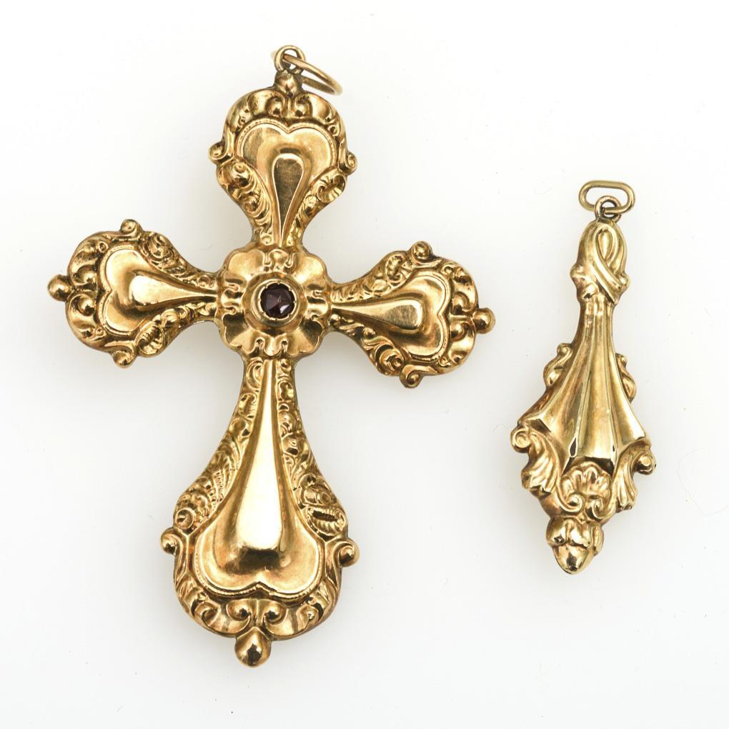 Relief cross and drop pendant with garnet.
