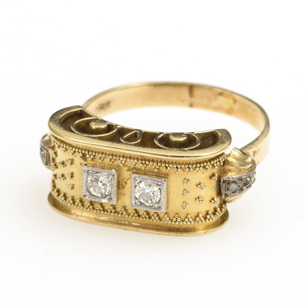 2 old-cut diamonds on granaly decorated ring head between center rail.