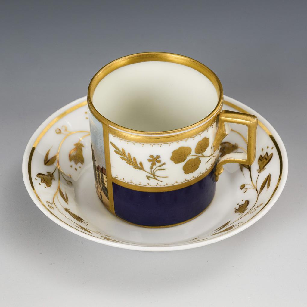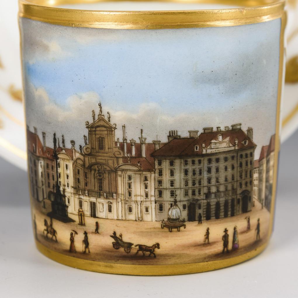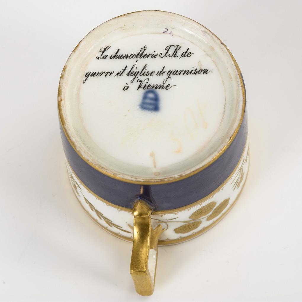 Cylindrical cup with angled handle. On the front a gold-framed rectangular cartouche with the view of the Imperial Royal Court War Chancery and the Garrison Church in Vienna inscribed in French on the underside, cobalt blue base band on the verso. 2 production-related chips on the rim of the mouth, rim and stand ground under the painting/gilding due to production.