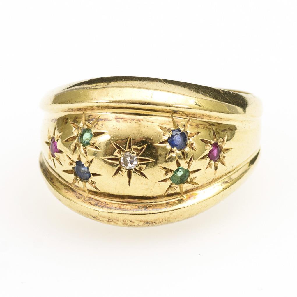 Small brilliant-cut diamond set in star engravings, 2 rubies, 2 sapphires and 2 emeralds between wide rail.