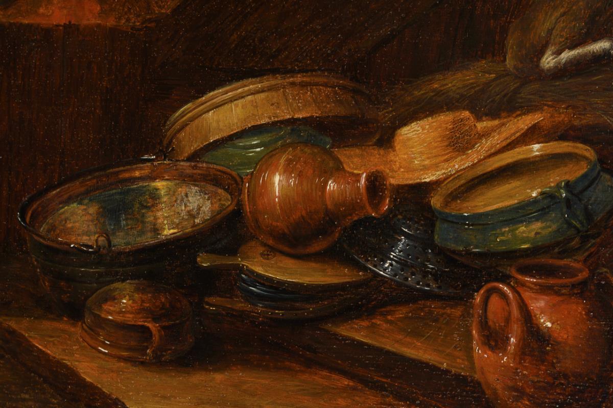 Peasants and goats in the stable with all kinds of vessels. Restored.