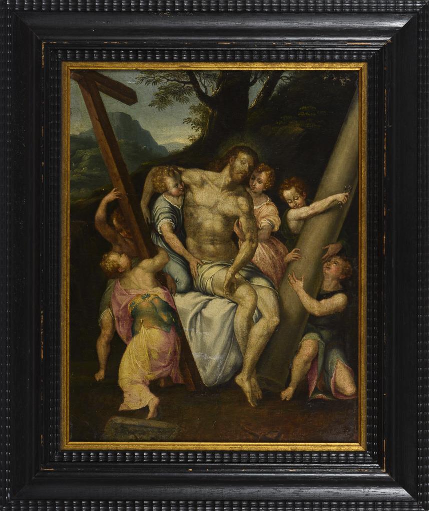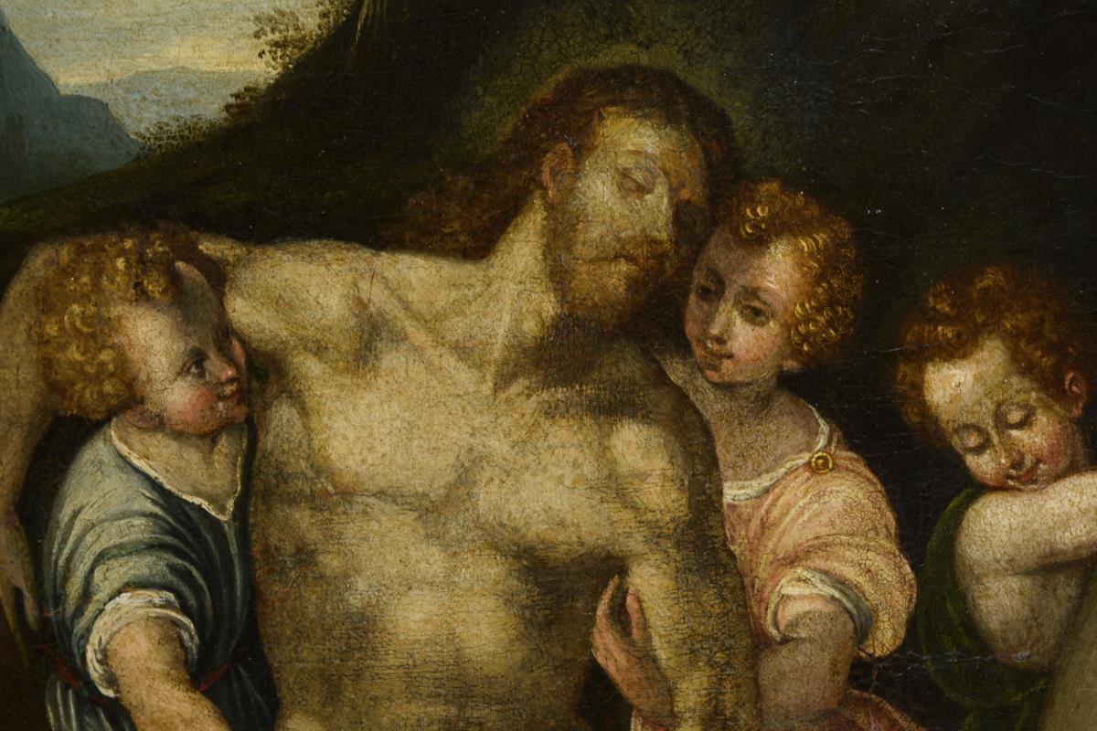 The body of Jesus after the removal from the cross, carried by putti. canvas doubled.