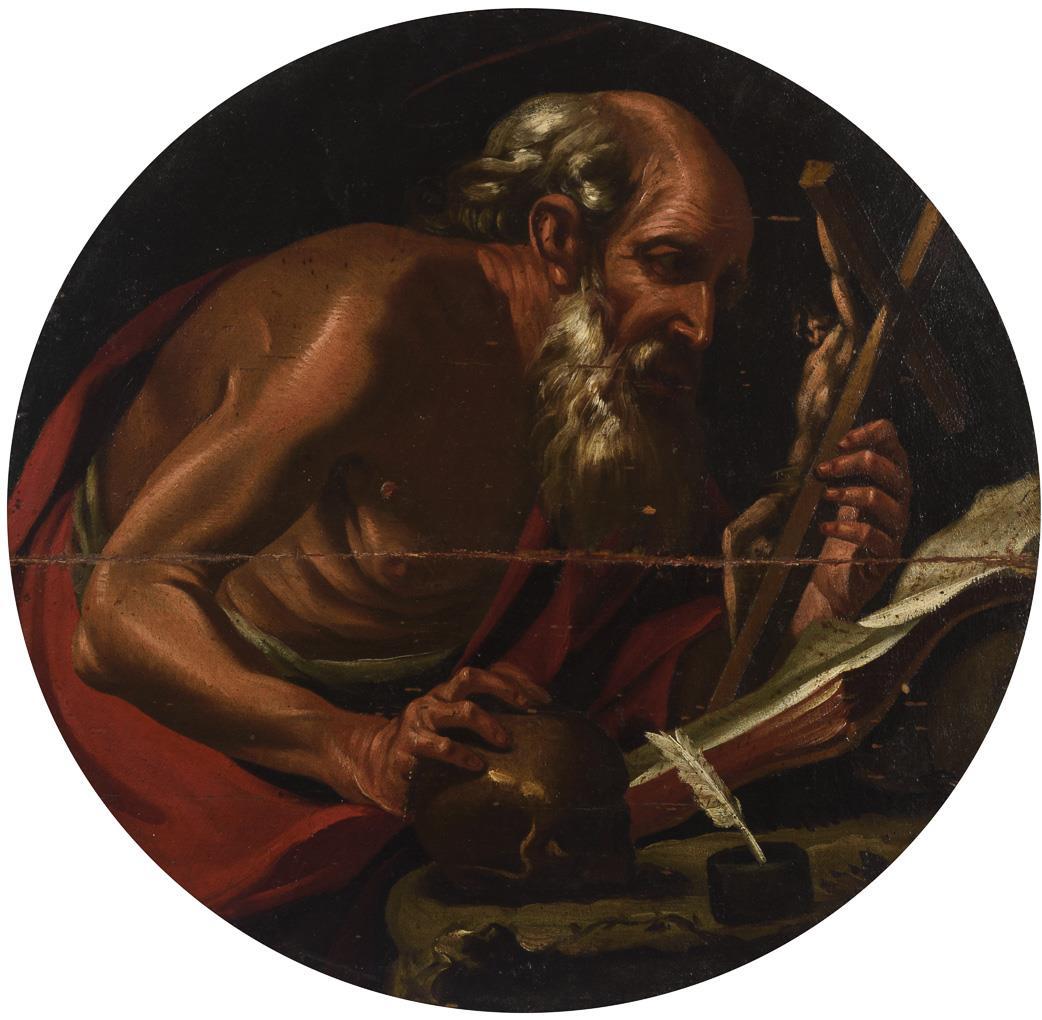 The saint depicted in old master manner with crucifix and skull. Restored.