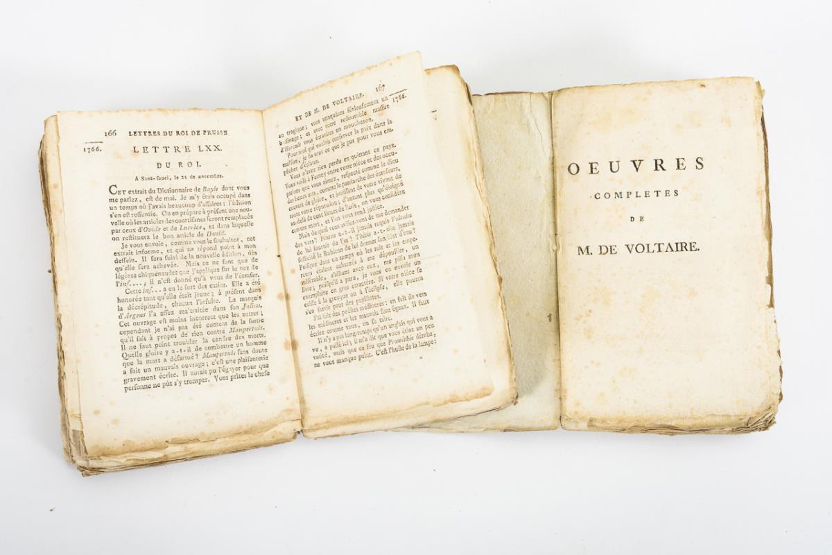 Bd. 24 "Essai sur les Moeurs et l'esprit des Nations", Block gebrochen; "Recueil des lettres de M. de Voltaire": Bd. 82 1742-1750; Bd. 83 1750-1752 July; Bd. 84 August 1752-1755 June; Bd. 85 July 1755-1759; Bd. 88 May 1762-October 1763; Band 90 1765-1766; Bd. 91 1766-1767; Bd. 92 1767-1768; Bd. 94 1770-1772; Bd. 96 1775-1778; Bd. 76 "Letter from the King of Prussia" 1749-1772 und zwei Fragmente. Unbeschnittene Broschurausgabe, bestoßen.
