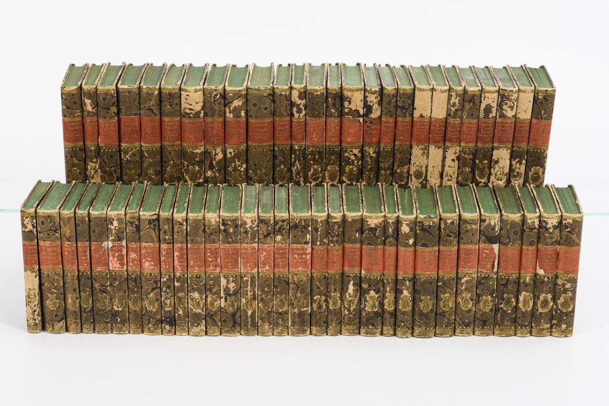First complete edition of the works. "Philosophy and History" 22 volumes; "Literature and Art" volumes 1-19, (missing 10 and 16); "Religion and Theology" 18 volumes. Marbled paperback, green edges. Spine partly more rubbed.