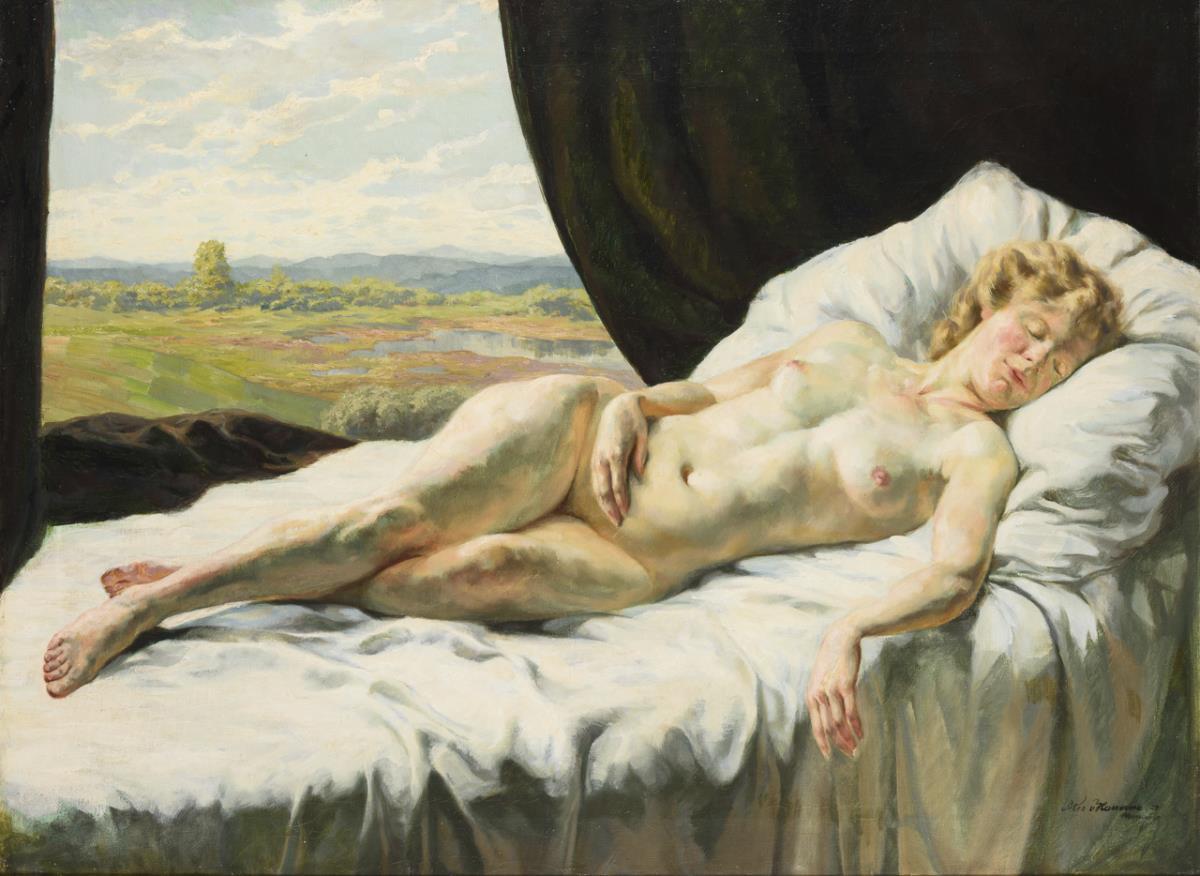 Sleeping, naked young woman on a bed covered with white sheets at a window with a view of the vast landscape.
