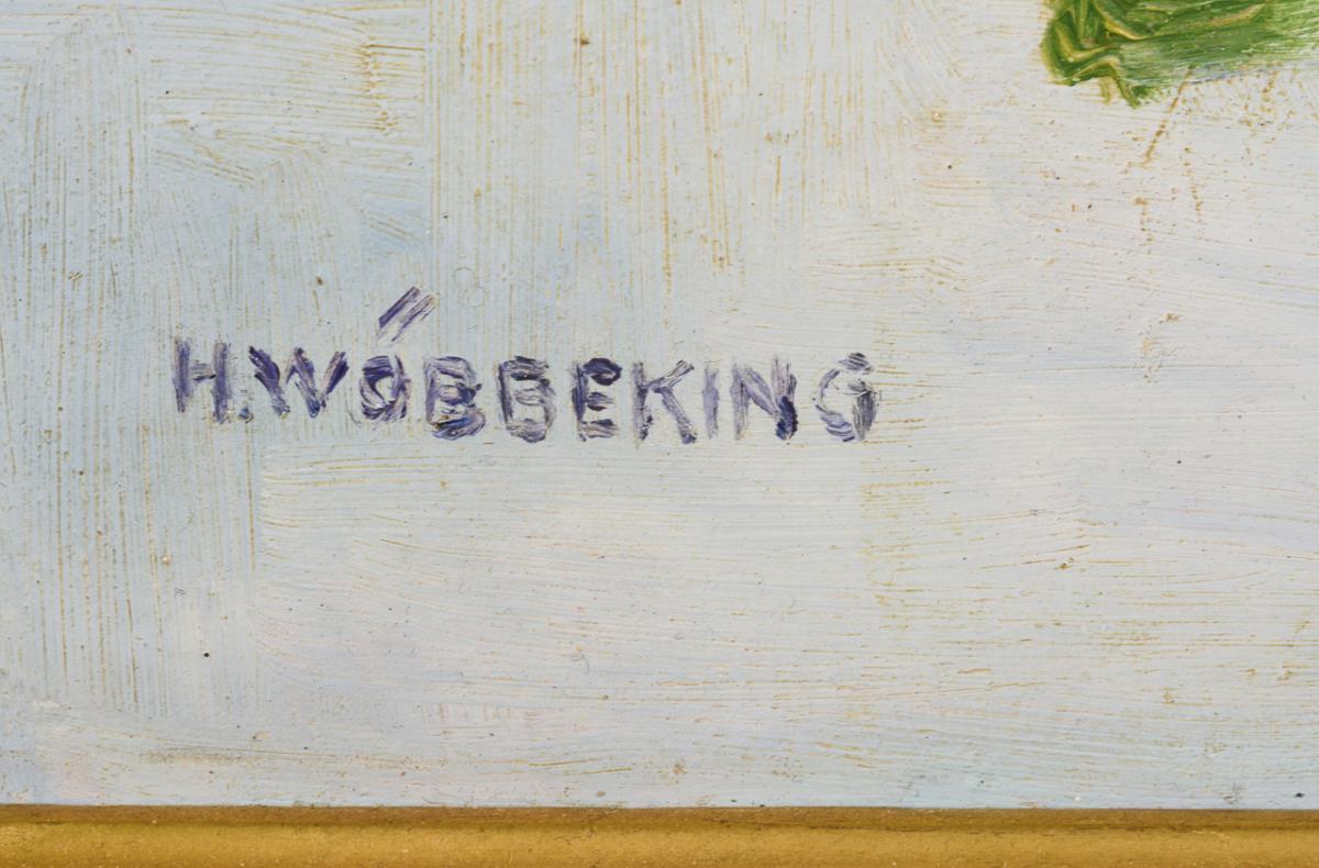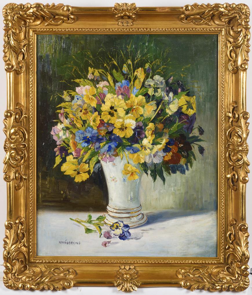 Many pansies in different colors in a slender porcelain vase with floral painting.