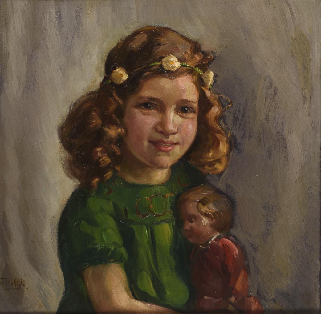 The girl with wreath of flowers in her hair and toy doll on her lap.