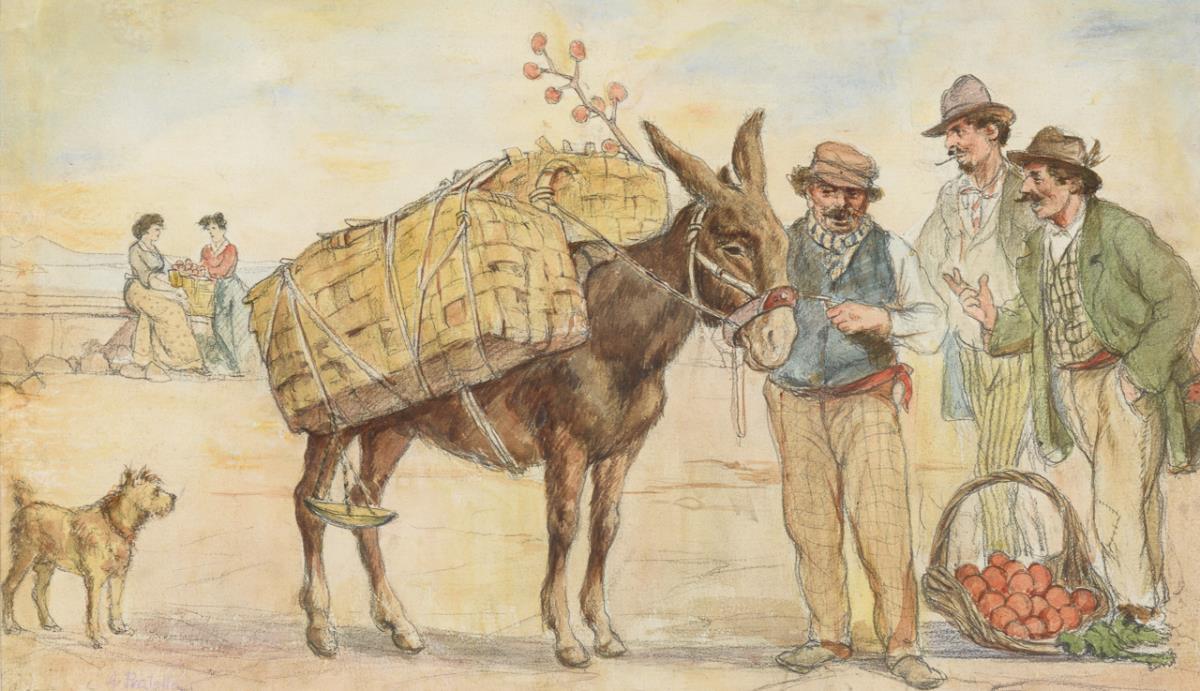 The Merchants with the Donkey Talking on the Coast in the Sunshine.