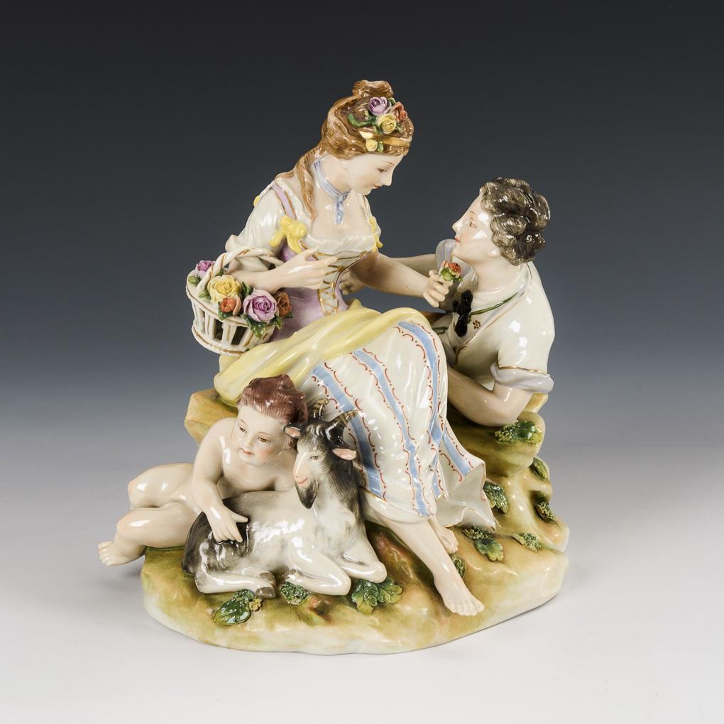 Sculpture of a lady with lover, on her right a putto with billy goat lying. Partially leaves, right hand of the lady and right thumb of the man restored.
